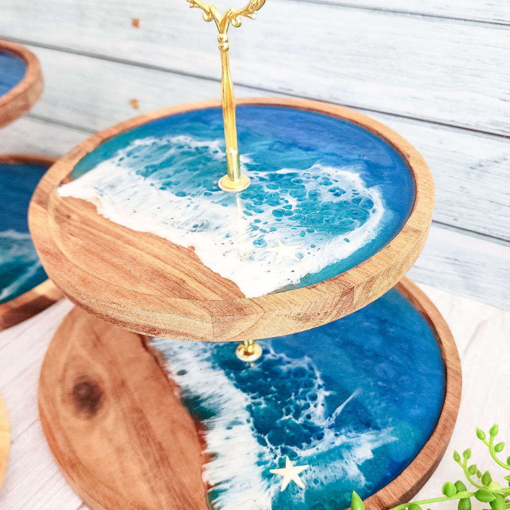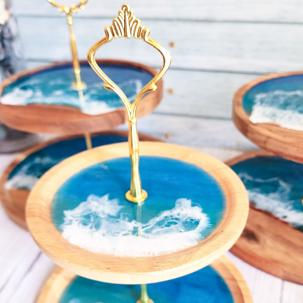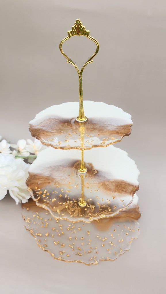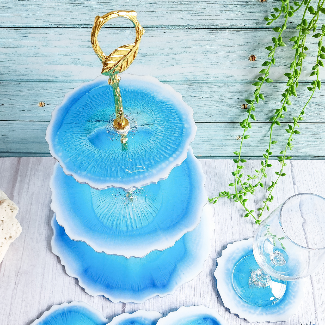 Get your cake on with this 3-tier stand! Perfect for parties or just everyday use, this resin set includes 4 coasters, making it a great housewarming gift for any cake-lover.